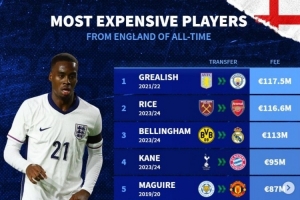 英格兰球员转会费榜:格拉利什、赖斯、贝林均过亿,吉滕斯第9