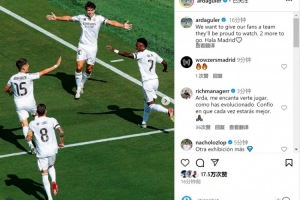 居勒尔社媒晒出与队友一起庆祝的照片,并写道:“我们想成为球迷引以为豪的球队,还剩两场,Hala Madrid!”