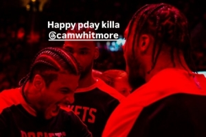 前队友杰伦-格林在INS转发了两人的合照,并写道:“祝你生日快乐,杀手惠特摩尔。”