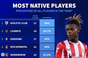 体育资讯7月13日讯 《转会市场》统计了当前五大联赛一线队本土球员占比情况,毕巴是唯一超过9成的球队。