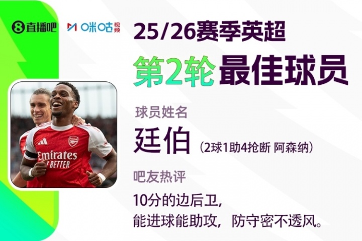 体育资讯8月27日讯 2025-2026赛季英超火热进行中,体育资讯和咪咕体育联合发起每轮英超最佳球员评选活动!第二轮评选结果结出炉,阿森纳后卫廷伯2球1助4抢断,攻守兼备的他获得吧友近四万吧友的投票支持,以较大优势当选 【体育资讯X咪咕体育英超第2轮最佳球员】!