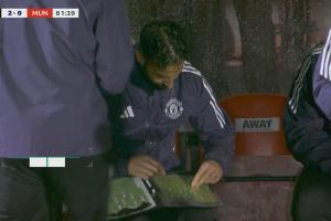 体育资讯08月28日讯 联赛杯曼联vs格林斯比,第62分钟镜头给到场边,阿莫林在场边拿着战术板。
