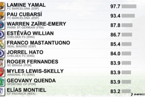 体育资讯8月28日讯 CIES(瑞士足球天文台)评出今年非门将U20球员的表现,亚马尔成为评分最高的球员,库巴西第二。