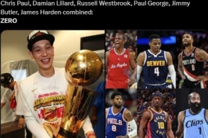 “哈登、保罗、利拉德、威少、乔治和巴特勒加起来0冠,但林书豪有1冠。”NBA Memes写道。