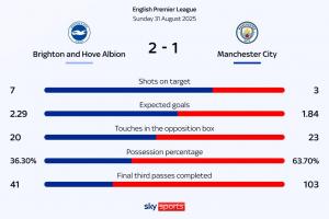 下一篇: 布莱顿2-1曼城全场数据:射门12-12,射正7-3,控球率36%-64%