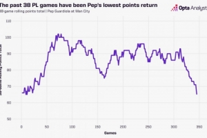 以连续38场联赛的积分而论,这也是曼城自2016年11月以来的最低积分,而彼时瓜帅刚刚执教了11场比赛。
