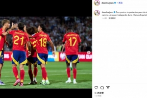 他也在赛后通过社媒晒出和队友们庆祝的合照,并配文:“开启我们(世预赛)旅程的关键3分。让我们继续努力。西班牙加油!”