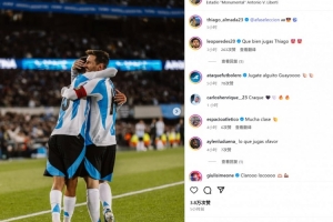 蒂亚戈-阿尔马达在赛后也晒出他和梅西的相拥庆祝照,并艾特了阿根廷国家队官方社媒:“🇦🇷😎⚽️”