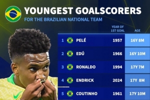 巴西最年轻进球榜:贝利16岁8个月居首 大罗&内马尔&埃斯特旺在列