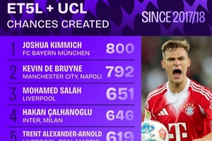 近9年五大联赛+欧冠创造机会榜:基米希压德布劳内居首 梅西第6