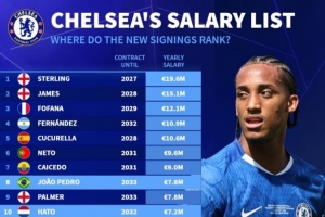 德转列切尔西队内年薪榜:斯特林1960万居首,仅5人超千万欧