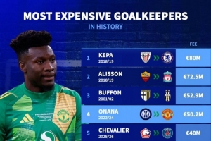 门将转会费排名:凯帕8000万欧居首,阿利森、布冯、奥纳纳前四