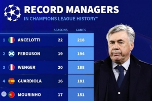 德转列欧冠执教场次排行:安切洛蒂218场居首,弗格森温格二三位