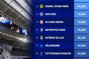 新赛季欧冠10大容量最大球场:伯纳乌83186人居首