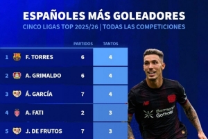 本赛季五大联赛西班牙球员进球榜:费兰、格里马尔多6场4球居首