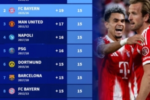 体育资讯9月29日讯 德转列出五大联赛开局5轮后最佳战绩,本赛季拜仁5连胜19个净胜球排在第二位,切尔西10/11赛季5连胜20个净胜球第一。