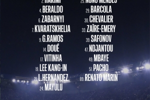 前锋:7-克瓦拉茨赫利亚、 9-贡萨洛-拉莫斯、14-杜埃、19-李刚仁、29-巴尔科拉、47-恩贾恩图、49-姆巴耶