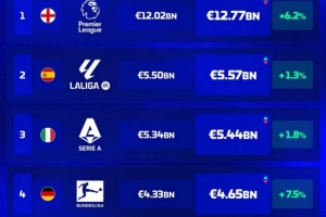 体育资讯10月20日讯 德转此前更新了足坛球员身价,并盘点了五大联赛球队总身价榜,其中英超遥遥领先,以下为具体情况: