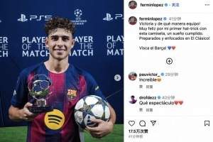 体育资讯10月22日讯 在本轮欧冠小组赛的一场比赛中,巴萨主场6-1击败奥林匹亚科斯,比赛中巴萨边锋费尔明上演帽子戏法。