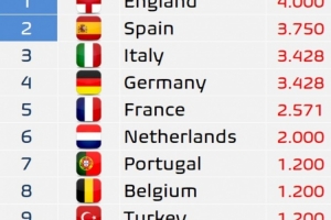 在赛季尚未开始之际,英格兰已经累积了4分的国家系数积分。这主要得益于他们六支参加欧冠的球队每队获得了6个额外积分,总共36分,平均分配给九支球队后,每队获得4分。而西班牙则将以第二名的位置开启新赛季,并同样有望获得一个额外的欧冠席位。