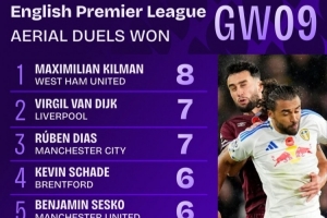 体育资讯10月28日讯 英超第9轮战罢,据Squawka数据统计,西汉姆后卫基尔曼是本轮赢得空中对抗次数最多的球员,共计8次。