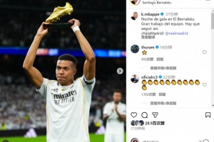 姆巴佩社媒晒出赛前展示欧洲金靴奖杯的照片,配文:“伯纳乌的华彩之夜,全队都表现出色,我们要继续保持!Hala Madrid!”