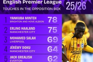 本赛季英超在对方禁区内触球榜: