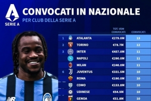 意甲被国家队征召人数榜:亚特兰大13人最多,国米、米兰11人