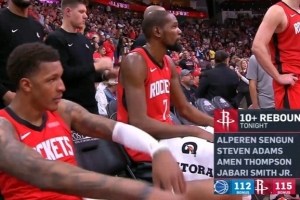 本场比赛火箭四人篮板上双,据现场统计,这是自队史2001年来首次。